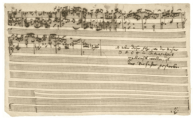 J.S. Bach, “Die Kunst der Fuge” (The Art of Fugue) (1740s). Bach died before completing the final fugue, Contrapunctus XIV, which embeds his own name in the music. Listen here.